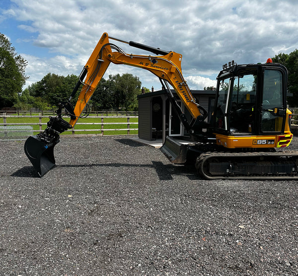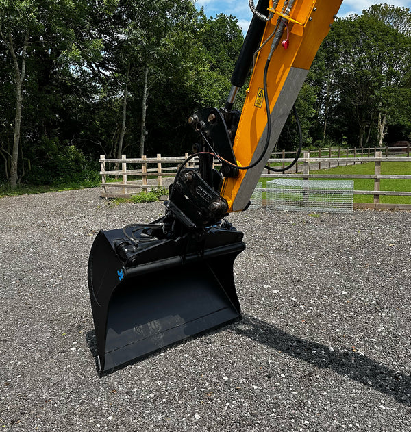 A quality excavating and landscaping attachment for mini and micro excavators. This Scandinavian style hydraulic tilt bucket features a two high quality hydraulic cylinders, hardened HB400 cutting edges and high tensile steel throughout.
