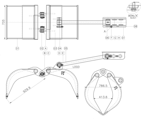 The crowd function of the bucket ram is used to operate the opening and closing of the grab so no internal hydraulics are required. Unlike the smaller models in this range the MSG6 uses a heavy duty tube design to connect the rear jaw of the grab to welded plate on the dipper arm.